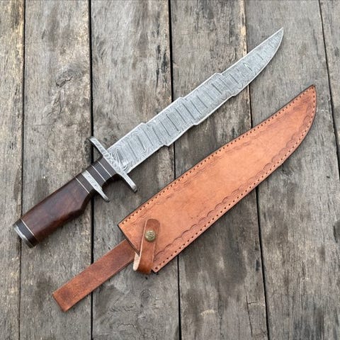 Dette er en bemærkelsesværdigt forarbejdet og håndlavet køkkenkniv fremstillet af de fineste knivmagere i USA. Dette er et meget flot håndlavet sæt af Custom Handmade Collectibles Chef Knives (5) Rose Wood-håndtag, Premium læderrulle. Kniven har et behageligt greb. Bladet er af særligt smedet stål med høj skærekant. Denne kniv er såvel et samlerobjekt som et brugbart køkkenredskab. Knivene har en længde på ca. 34 cm.