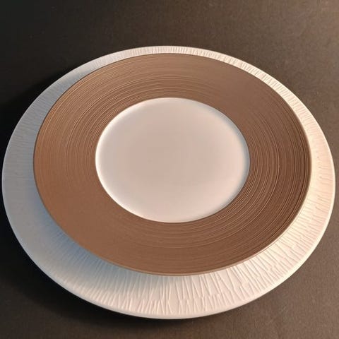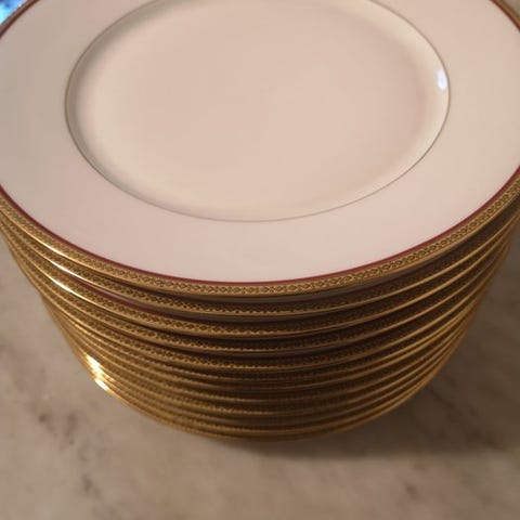 Splinternyt og elegant bordservice i fineste porcelæn fra Limoges, produceret i 1920’erne/30’erne af den berømte manufaktur T.L.B. (Touze, Lemaitre og Blancher). Sættet er et perfekt eksempel på Art Déco-stilen, kendetegnet ved en moderne ottogon form og geometriske, polykrome dekorationer.