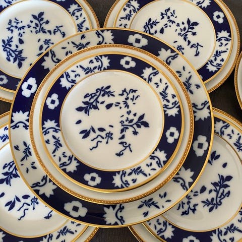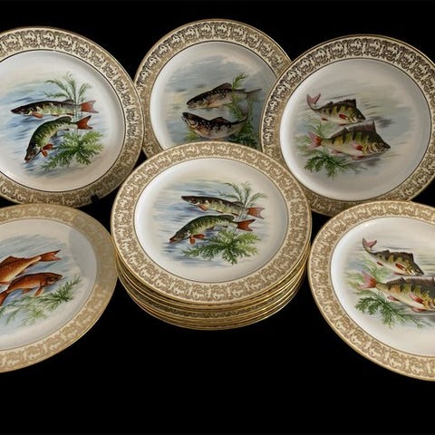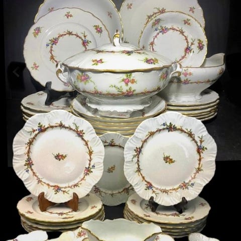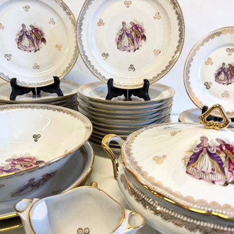 Et smukt og sammenhængende sæt, ideelt for samlere eller til sofistikeret bordopdækning. Limoges-stykker af denne type værdsættes konsekvent på markedet for deres forfinethed og dekorative appel.