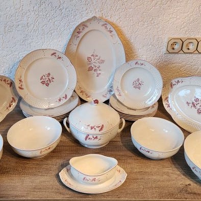 til salg står et kvalitetsfuldt, fler-delt sæt af VITRO-porcelæn fra det anerkendte mærke Villeroy & Boch fra serien „Val Rouge“. Serviceet byder på en elegant formgivning med fint reliefgitter og den karakteristiske, vinrøde blomsterdekoration på cremehvid bund.