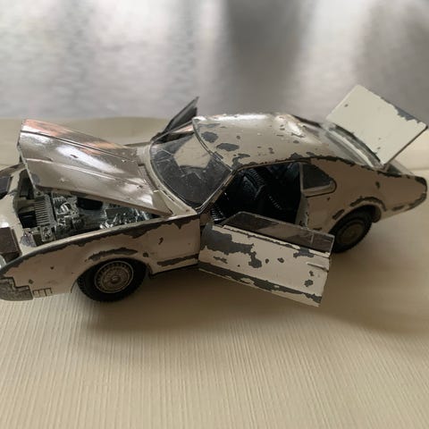 Tekno MG TD Modelbil i form af en klassisk cabriolet. Bilen er rød med grøn kabine og brun bagende ved reservehjulet. Den har åbent førersæde med rat og lille forrude. Underdelen er sort med simple hjul og kofangere foran og bagpå. Egnet som legetøj eller til udstilling og dekoration. Bilen er renoveret.