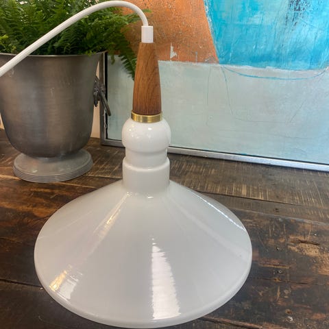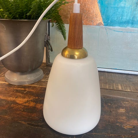Super fin og enkel pendel i opalglas med top af lys teaktræ og messing. E27 fatning. H30/20 Ø15.. gir et super fint lys. Pris 550,- #shopnlop #pendel #opalglas #luksusgenbrug #vintage