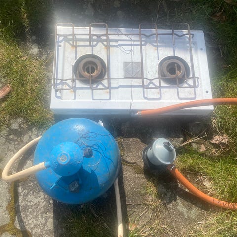 Gasblus med tilhørende gasflasker i metal. Sættet består af et enkelt blus monteret på en gul metalflaske samt en separat gul metalflaske uden blus. Velegnet som simpel udendørs kogeenhed, fx til camping eller havebrug,