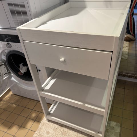 IKEA puslebord i hvid. Bordet har en forhøjet kant rundt om puslefladen og to åbne hylder under til opbevaring af fx bleer, tøj og tilbehør. Velegnet til brug på børneværelset eller i badeværelset som fast pusleplads.