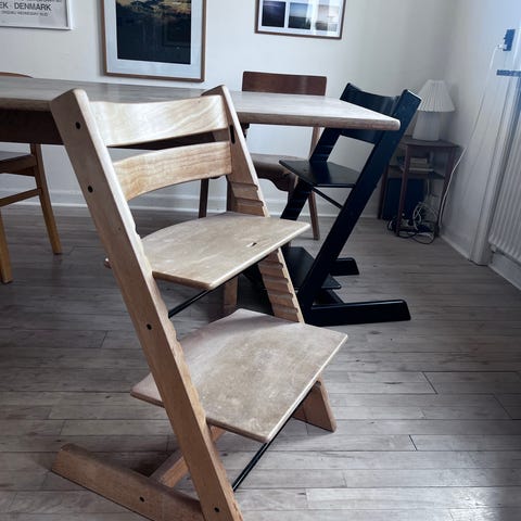 Stokke Tripp Trapp højstol i træ. Klassisk justerbar højstol med regulerbar siddeplade og fodplade, der kan tilpasses barnets højde. Egnet til brug ved spisebord eller som siddeplads i hjemmet. Med tværstang i metal for ekstra stabilitet.