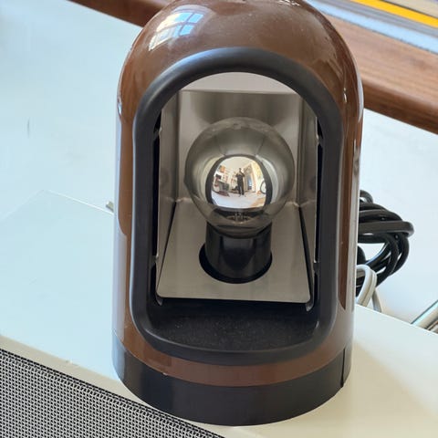Udført i rød lakeret metal med justerbar arm og integreret skærm.