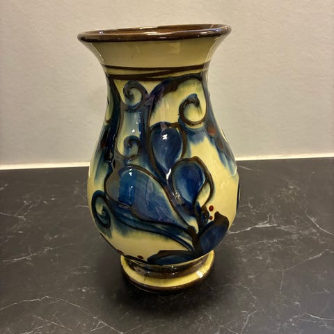 Danico vase fra 1920'erne ca produceret i Danmark. Den er lime men jeg syntes at det ville være synd og skam at kasser den vasen er håndmalet sikkert med hornteknik (kohornsmalet)
