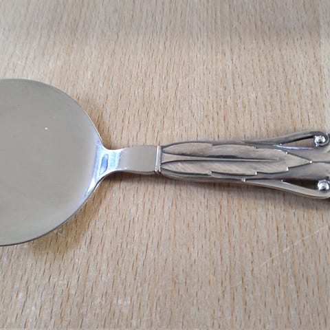 5 dele i tretårnet sølv fra Johannes Siggaard. Skaftet er tretårnet sølv og resten er rustfrit stål.