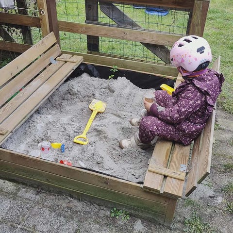 Fin sandkasse (2 dele) I blå plast. Formet som muslingeskaller, så den ene halvdel kan være låg, når sandkassen ikke bruges. Kan også bruges som soppebassin. Ser næsten ud som ny, da den kun har været brugt til vandleg i haven.