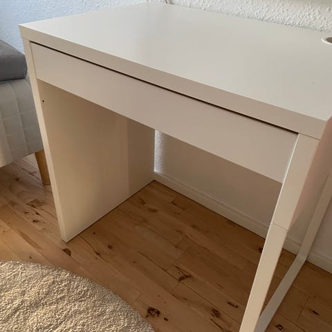 Brugt skrivebord fra IKEA i lakeret birk. Har en del brugsspor, men kan blive pænt med en gang maling.