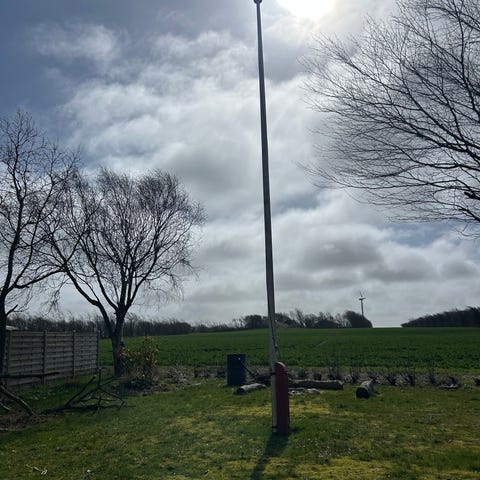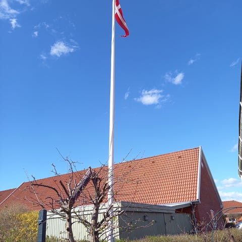 Høj flagstang med rød top, tilhørende snor og flag samt vinkelbeslag.