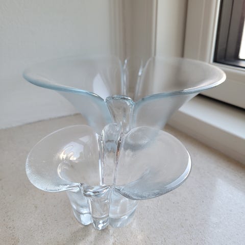 Multifunktionel: håndlavet glasskål, krystalskål, lysestage, fyrfadsstage, asiet, æggebæger. Matteret bund/yderside.