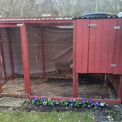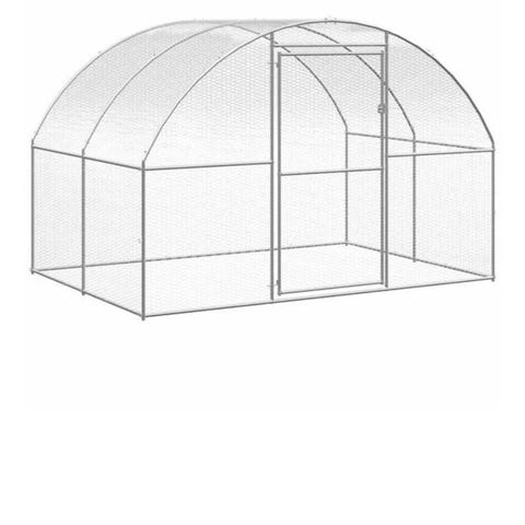 Kanin/Hønsehus / hønsevoliere med løbegård i metalramme og trådnet. Konstruktionen består af buede metalbuer og trælister med net på sider og front samt dør med lås. Overdelen er delvist overdækket med presenning for læ og beskyttelse mod vejr. Medfølgende løse dele omfatter blandt andet trådsektioner og en separat trækasse, der kan anvendes som redekasse eller skjul. Velegnet som udendørs indhegning til høns eller andre mindre dyr i haven eller på mindre landbrug. lavet med net i bunden så dyrene ikke kan grave sig ud og andre dyr ikke kan gnave sig ind. Der er medfølger ca. 2 kg kanin mad.