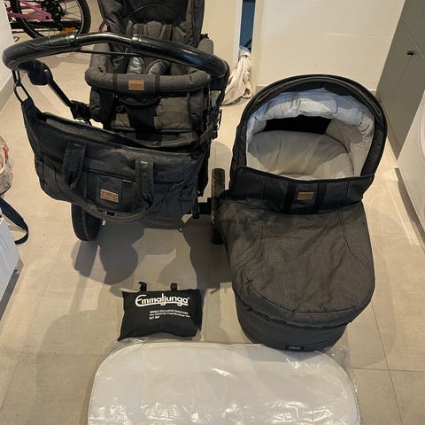 Skummadres til barnevogn medfølger samt søskendebræt og barnevognsele.