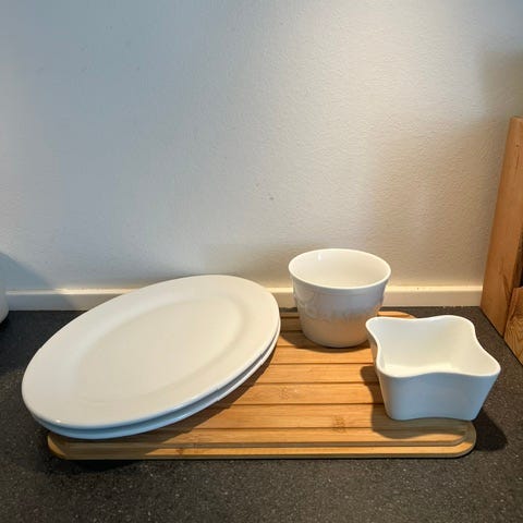 Sælger her en samling af 5 fine og funktionelle dele i hvidt porcelæn. Alle dele er i flot og velholdt stand uden skår eller revner. Perfekt til både hverdag og servering.