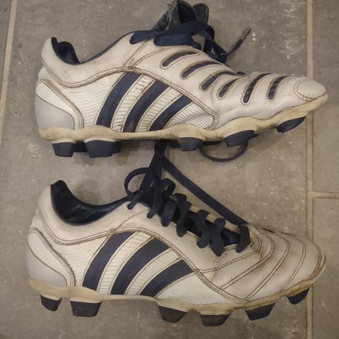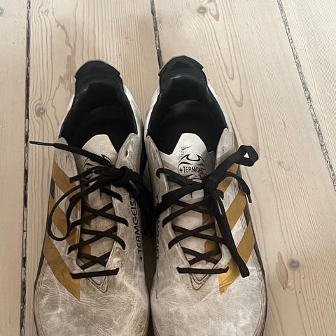 Adidas fodboldstøvler i hvid, sort og gul farvekombination. Overdel med snørelukning og elastisk sort vristdæksel med Adidas-logo. Ydersål med faste knopper til brug på græsbaner. Velegnet til fodboldtræning og -kamp udendørs.