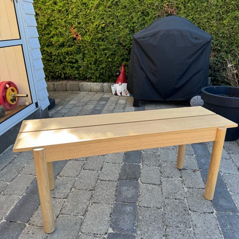 Bænk med lameller i massiv egetræ. Fremstår særdeles flot og har ingen synlige brugsspor. Mål; bredde 100cm. Dybde 40cm. Højde 45cm.