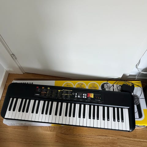 Rigtig fint begynder keyboard med stativ og klaverbænk. Der er lys i tastaturet, som også hjælper nybegynder med at placere fingrene. Det er ikke brugt meget. Den eneste grund til, at det står som brugt er, at jeg lige knækkede den ene side af nodestativet af, da jeg skulle tage billeder. Det fungerer stadig og kan evt limes.