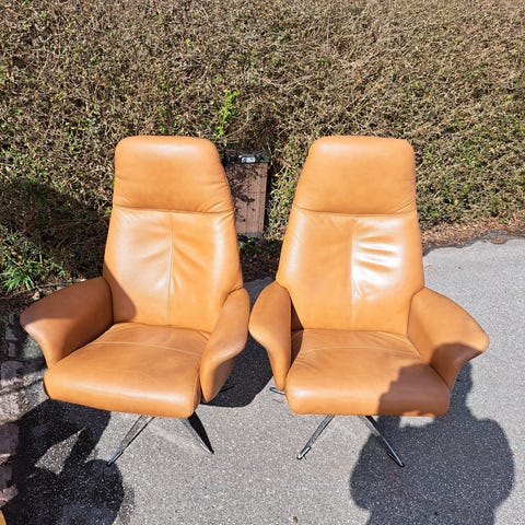 Danskproducerede lænestole og puf i virkelig flot stand.