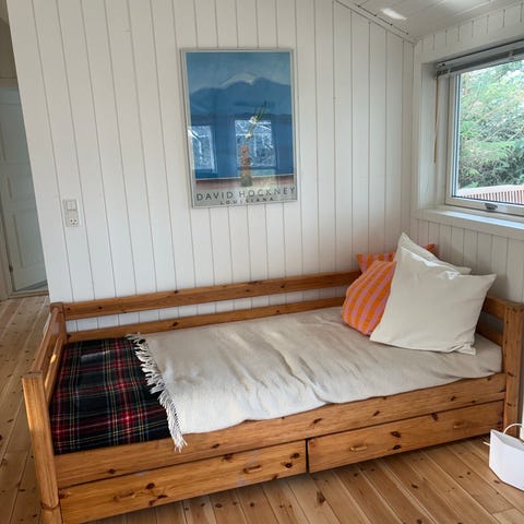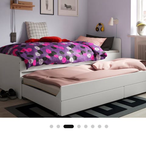 IKEA dagseng i hvid med integreret udtræksseng og opbevaringsskuffer. Sengen fungerer som enkeltseng til daglig brug og kan trækkes ud til ekstra soveplads. Under sengen er der flere skuffer, som kan bruges til opbevaring af sengetøj eller tøj. Klassisk, lige design i træ/ træmateriale, velegnet til børne- eller gæsteværelse.