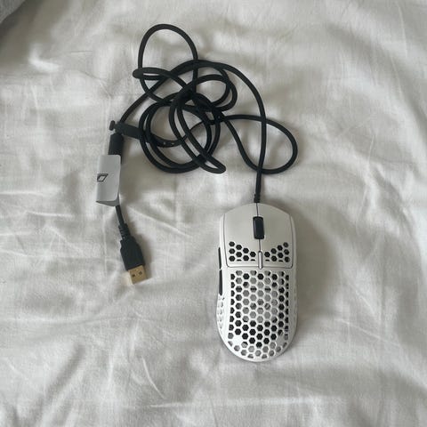 NG Volcano Gaming Vapour mus i hvid farve. Kablet USB-mus med perforeret kabinet og letvægtsdesign. Nederst ses optisk sensor og glideflader. Egnet til brug med computer som standardmus eller gamingmus, afhængigt af behov og indstillinger. Tilsluttes via USB-A stik til kompatible computere og enheder.