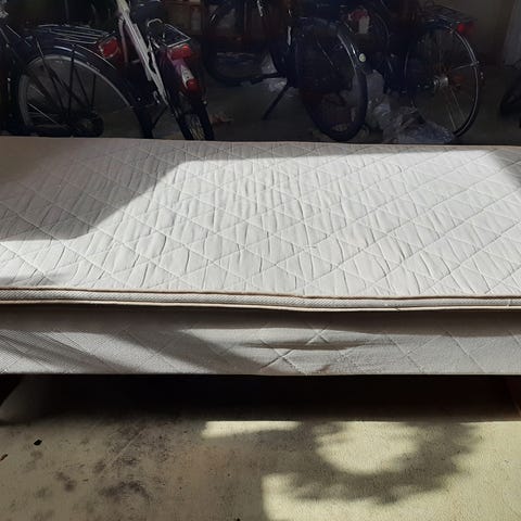 Jysk boxmadras med topmadras. Sengen består af en mørk boxmadras på træben med en lys, quiltet topmadras øverst. Velegnet som enkeltseng i soveværelse, gæsteværelse eller ungdomsværelse.