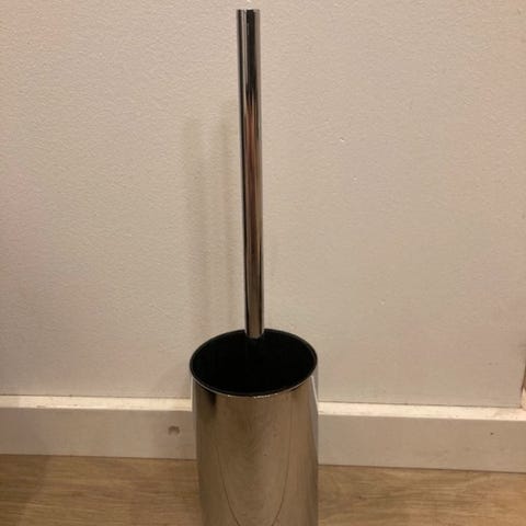 Toiletbørste i mørkegrå stål med hvid børste. Sættet består af en cylindrisk beholder og tilhørende børste med håndtag. Størrelse ca. 9,7 x 38,4 cm, egnet til placering ved siden af toilettet i badeværelset.