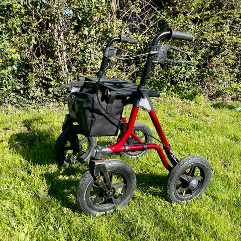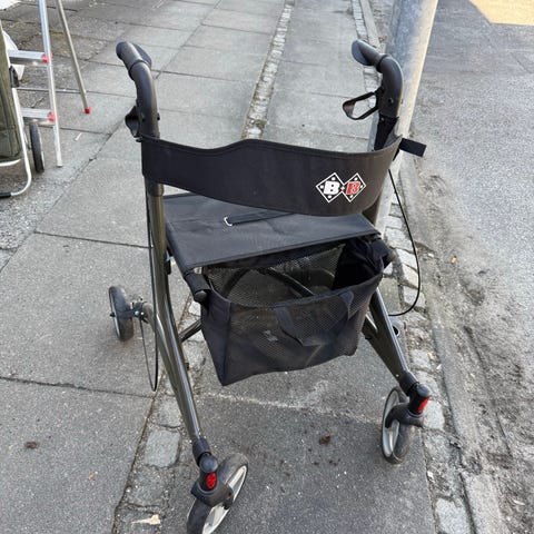 Mobitex Gepard rollator i sort kulfiber. Letvægtsmodel med tre hjul og låsbare håndbremser total kun 5 kg. Rollatoren har indkøbstaske/kurv foran samt stabile softgummihjul velegnet både inde og ude. Brugt få gange står i perfekt stand.