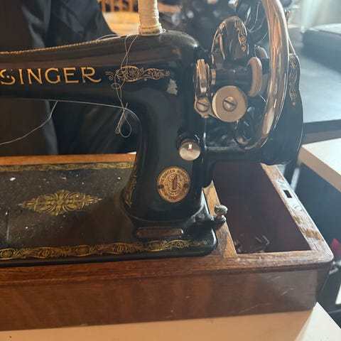 Singer symaskine med træbord og pedalstel