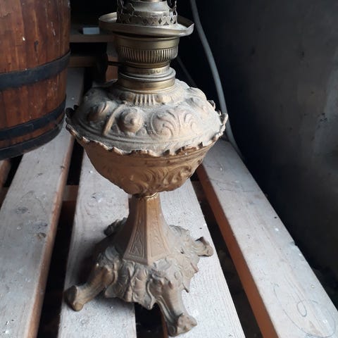 Olielampe i glas i grøn farve. Lampen har en rund fod, metalbrænder og høj, klar glas-cylinder. Velegnet som dekorativ belysning eller stemningslys i indretningen.