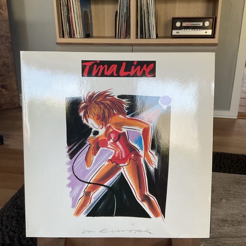 Tina Turner Tina Live lp. Vinylplade med liveoptagelser fra koncert med Tina Turner. Cover med illustreret motiv af kunstneren på scenen. Egnet til samlere af Tina Turner og liveudgivelser på vinyl.