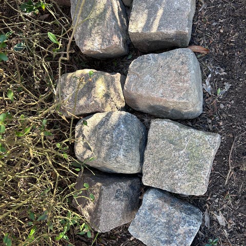 Brosten i natursten. Stenene er skåret i kvadratiske blokke og egner sig til belægning, kantafgrænsning eller dekorative formål i have og indkørsel. Farven er naturlig stenfarve med nuancer i grå og brun. Velegnet til udendørs brug på grund af den robuste natursten. En trillebør fuld.