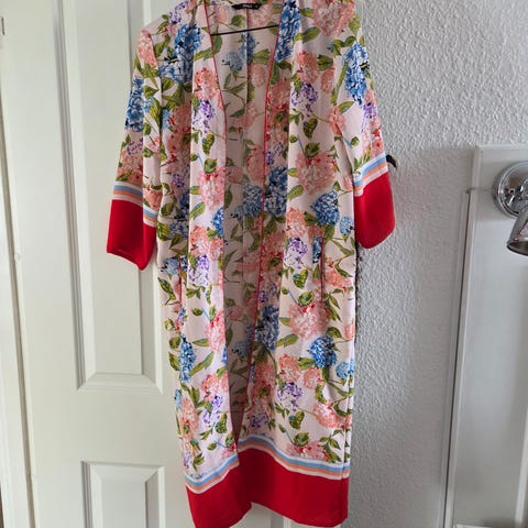 Let kimono/slå-om kjole med lækker ærmedetalje. Halv lang.