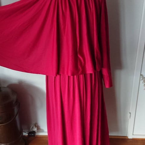 Sæt med forskellige damekjoler og kostumer i flere farver og mønstre. På billederne ses blandt andet to kostumer i sort og rød med takket kanter samt flere kjoler i forskellige længder og snit, herunder ensfarvet sort kjole og kjoler med blomster- og grafiske mønstre. Velegnet til kvinde til både udklædning og hverdags- eller festbrug afhængigt af model.