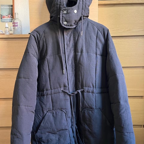 Flot indigo-blå vest med hætte. Passer str. S-L.