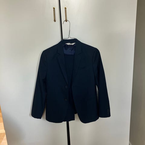 Drenge jakkesæt fra H&M str 158, i mørkeblå. Skjorten fra H&M str 152, i hvid.