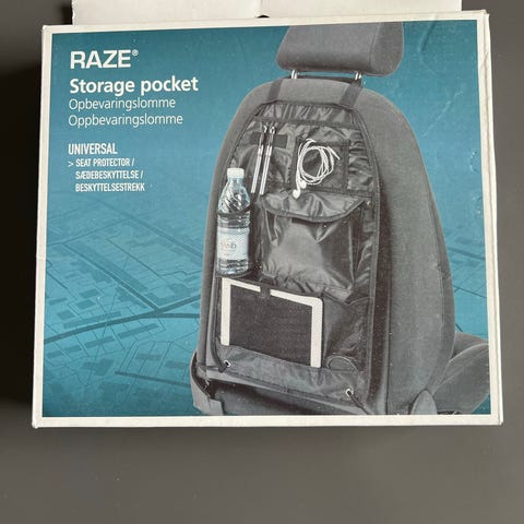 Monteres på bilsædets ryg med justerbare stropper. Velegnet til opbevaring af mindre genstande som legetøj, drikkedunke eller tilbehør i bilen. Fra Thansen, fin stand. Pris for begge.