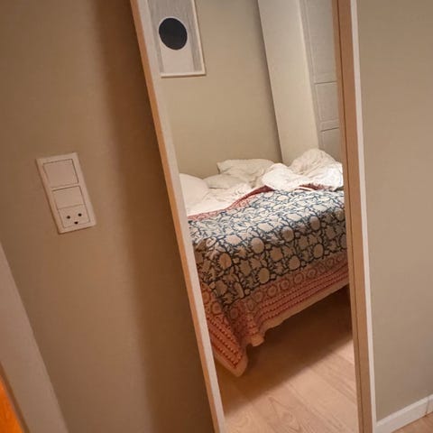 IKEA spejl med stativ i hvidlakeret metal. Fritstående gulvspejl med rektangulær spejlflade og ramme i metal. Bagsiden har panel med kroge til ophæng af mindre genstande. Stativet giver stabilitet og gør spejlet egnet til brug i soveværelse, entré eller garderobe.