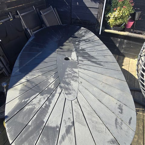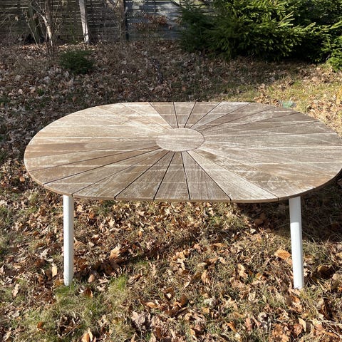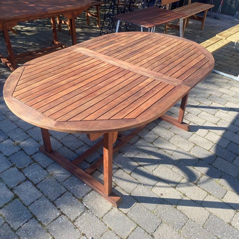 Ovalt havebord i træ. Bordpladen består af smalle trælameller og har udtræksfunktion med midterdel. Velegnet som udendørs spisebord på terrasse, altan eller i have. Bordet står på fire ben og er konstrueret til brug udendørs.