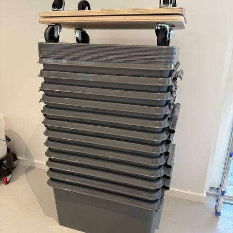 Home box, 70 l. med låg, hjul, håndtag og er stabelbar.