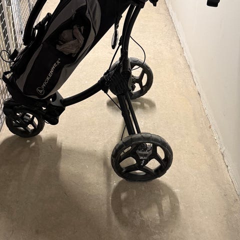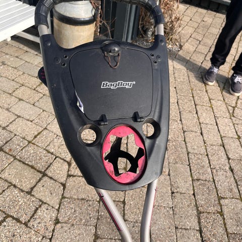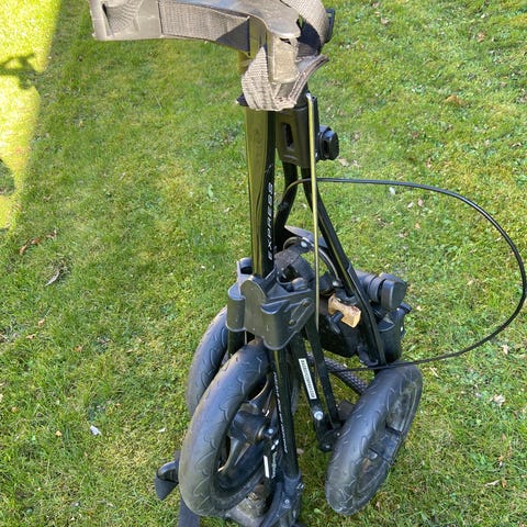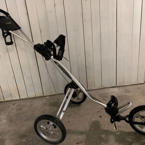 Rovic golfvogn med 3 hjul i sort. Vogn til golfbag med håndtag og stel i metal/plast. Egnet til transport af golfudstyr på golfbanen. Foldbar konstruktion, som gør den nem at opbevare og transportere i bil eller skur. Passer til de fleste standard golfbags, som fastgøres med stropper på vognen.