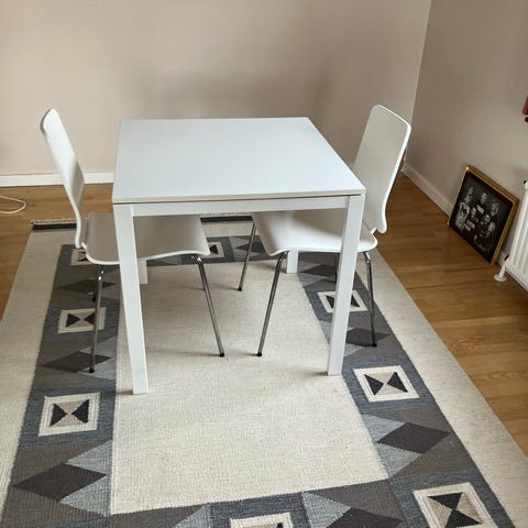 Lakeretbøg spisebord med 4 stofstole.