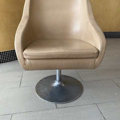 Smuk postmoderne loungestol i cognacfarvet læder med fantastisk patina. En skulpturel og komfortabel stol med masser af karakter – perfekt til stue, sommerhus eller loungeområde.
