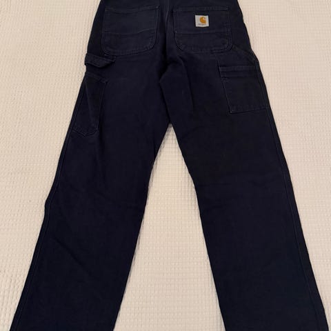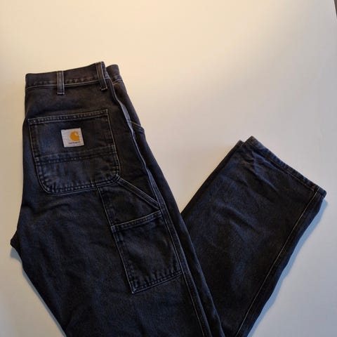 Carhartt jeans bukser i grå denim til herre. Inden i står der str. XS - Disse bukser har en tilsvarende størrelse til et andet par jeg har i str. W28 (taljemål). Fremstillet i slidstærkt denim-materiale med flere praktiske lommer, herunder store cargolommer på benene.