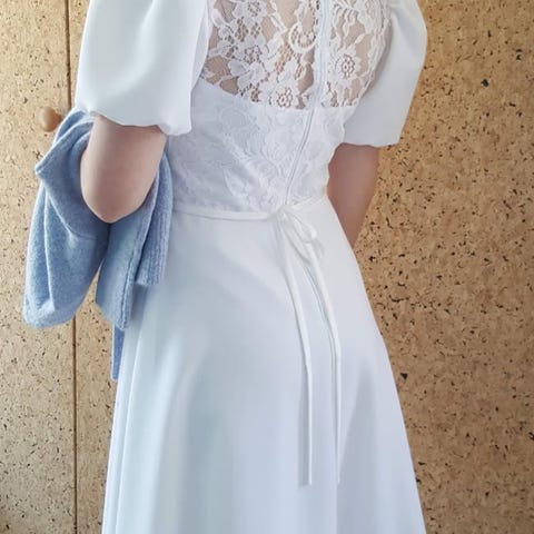 Model Dina, farve Ivory. Kjolen er kun brugt en gang, så den er som ny. Meget fin, feminin og elegant konfirmationskjole med blonder og flere søde detaljer. Fra Furhmanns. Str. 36. Inkl. lille stofbælte til. Opbevaret på bøjle i tøjpose, som også medfølger.