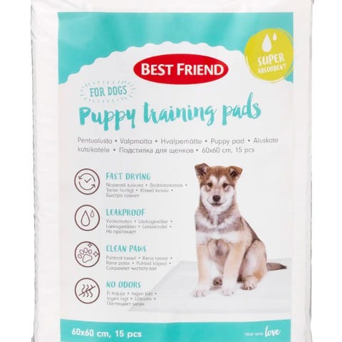 Vi sælger en 'Hvalpepakke' bestående af 1 transportkasse (MaxiZoo, 56 x 37 x 33), 1 fleecejakke (XS, Fashion Dog), 1 gåsele (XS, Ozami) og 1 pakke træningsunderlag.