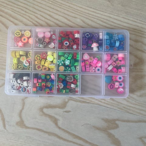 Perler i plast i opbevaringsæske med flere rum. Sættet indeholder perler i forskellige farver, blandt andet blå, rød, gul, grøn, sort, lyserød og orange. Perlerne er små og ensartede og egner sig til kreative projekter som smykker, dekorationer eller perleplader. Opbevaringsæsken er gennemsigtig med låg, så perlerne kan holdes adskilt og organiseret.