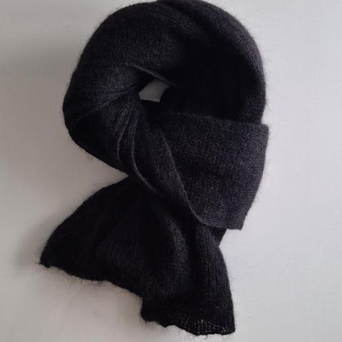 Halstørklæde, Håndvævet fairtrade fra Himalaya , str. 204x75cm., Sort med farvet bort, Yakokseuld , Ubrugt, Stort flot tørklæde af håndvævet yakokseuld, Fairtrade vævet af stammefolk i Himalaya. Sort med farvet bort, i den sorte vævning er der en fint lille mønster. Tørklædet er lige lidt over 2 meter plus frynser.