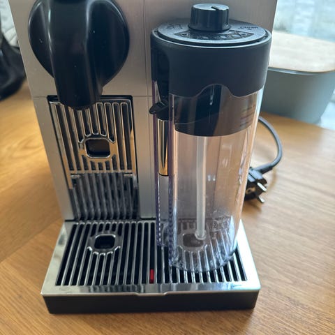 De'Longhi Nespresso kapsel espressomaskine. Maskinen anvender Nespresso-kapsler (eller dem som er konvertible)og har integreret mælkebeholder til tilberedning af drikke med mælk, som f.eks. cappuccino og latte.