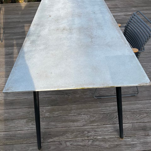 Havebord (2 x 0,9 m) i rektangulær form med grå metalstel og mørke, trælook kompositlameller på bordpladen. Medfølger ekstra bordplade, som ligger under. Udtræksstel er dog rustent, se billede. En enkelt lamel er løs i den ene side, se billede.